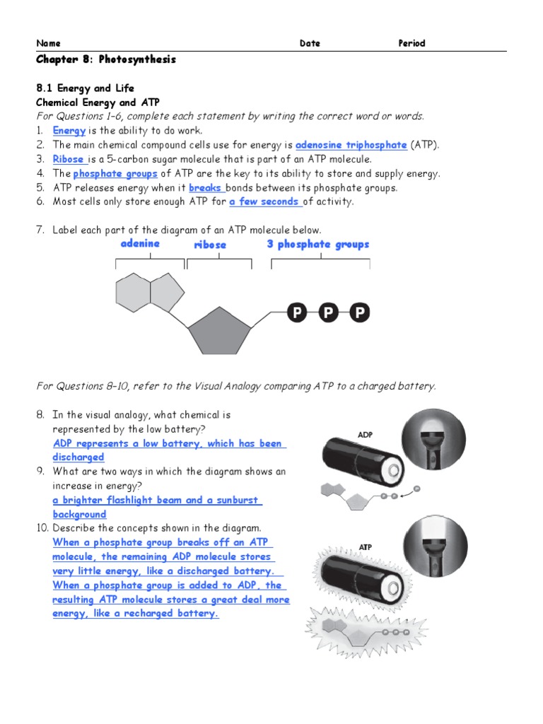 Adenosine Triphosphate (ATP) - HHMI BioInteractive When ATP binds to and activates BCR-ABL, it signals white blood cells to divide uncontrollably. Small-molecule cancer drugs such as Gleevec (imatinib) and dasatinib, which have structures similar to that of ATP, can bind to BCR-ABL in ATP's place and inhibit the kinase's activity. The 3D model can be viewed and rotated in the online 3D Viewer. quizlet.com › 572542554 › biology-chapter-3Biology - Chapter 3 Mastering HW Assignment Flashcards | Quizlet Drag the correct label under each diagram. Left: exocytosis - a process in which material inside a cell is packaged into vesicles and excreted into the extracellular medium Right: endocytosis - a process in which the plasma membrane invaginates or fold inward, to form a vesicle that brings substances into the cell ATP | Structure, Synthesis, Hydrolysis, Functions & Summary This energy is made available for cellular processes by ATP hydrolysis. The terminal two phosphate groups of ATP are linked to the rest of the molecule by high energy phosphate bonds. Each of these bonds releases 7.3 Kcal/mol of energy upon hydrolysis. The hydrolysis of ATP is a two-step process. What are the three parts of an ATP molecule - Quizlet What are the 3 parts of an ATP molecule adenine, ribose, 3 phosphate groups Energy is released from ATP when a phosphate is removed Organisms such as plants that make there own food are called autotrophs Plants gather energy with light-absorbing molecules called pigments Most plants appear green because chlorophyll doesn't absorb green light