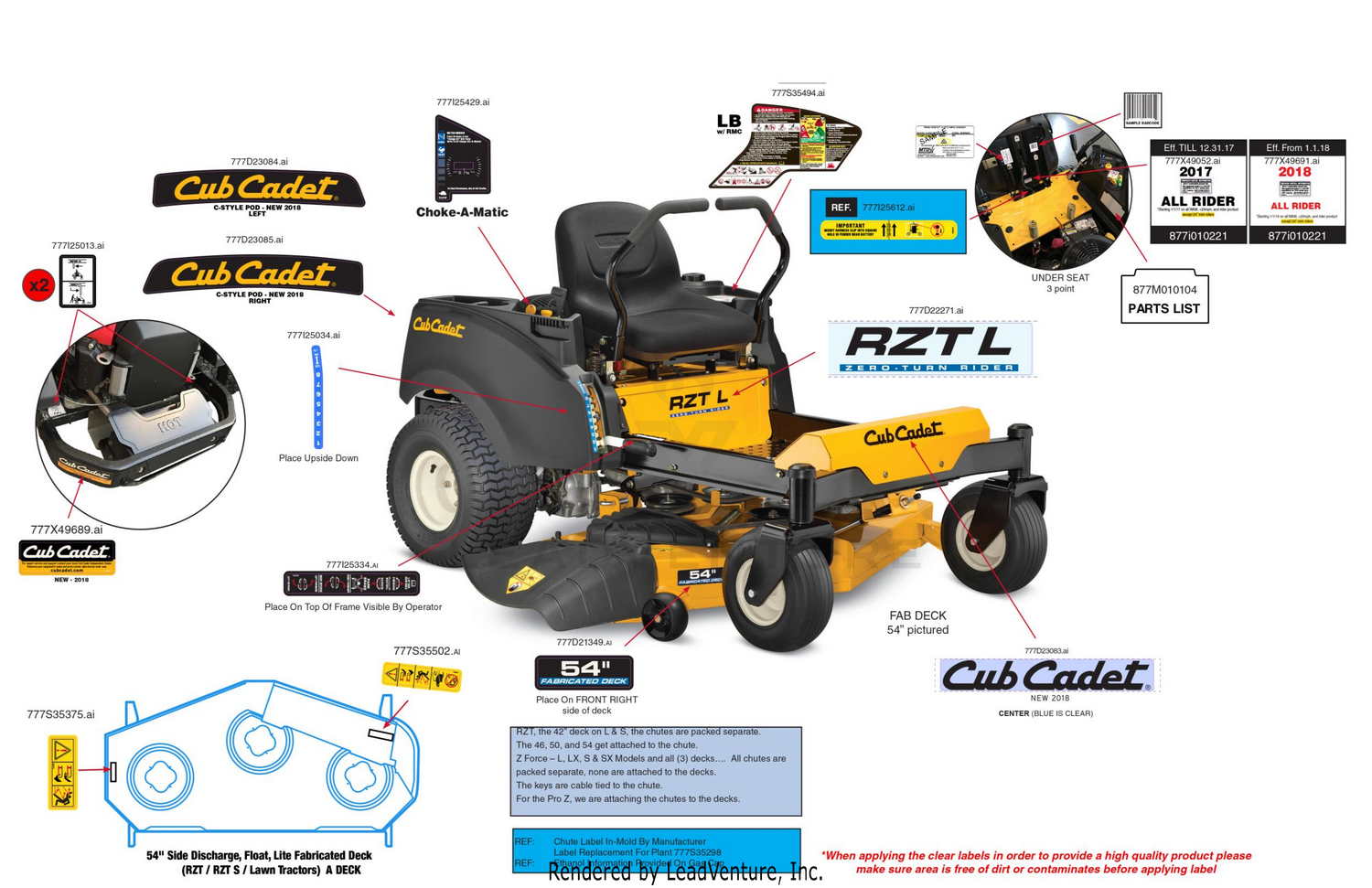 Cub Cadet Zero Turn Mower - Model 17BRCACA009 | Cub Cadet US Find parts and product manuals for your RZT-L54 KH Cub Cadet Zero Turn Mower. Free shipping on parts orders over $45. ... Xtreme® 2-in-1 Blade Set for 54-inch Cutting Decks. Item#: 490-110-C179. From $86.99 MSRP. In Stock. ... Lookup Parts via Diagram; Cub Cadet Gear; Extended Warranty; Independent Dealers. Find a Dealer; Dealer Delivery or ...