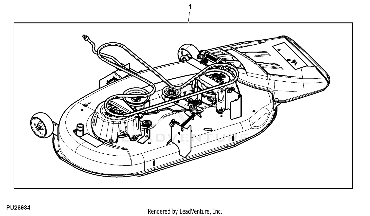 John Deere 42 Inch Mower Deck Parts Diagram The deck on your 42-inch John Deere lawnmower deck has two belt covers on either side. As the name suggests, the right-hand belt cover sits on the right side of the deck, shielding the V-belt from that end. The right-hand belt cover on your mower deck is black, so you should easily identify it by eyeballing the component. 2.