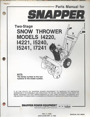 Snapper Snowblower Model I7243 Parts - Repair Clinic Snapper Snowblower Model I7243 Parts. Snapper Snowblower Model I7243 Parts are easily labeled on this page to help you find the correct component for your repair. Filter results by category, title and symptom. You can also view diagrams and manuals, review common problems that may help answer your questions, watch related videos, read insightful articles or use our repair help guide to get ...