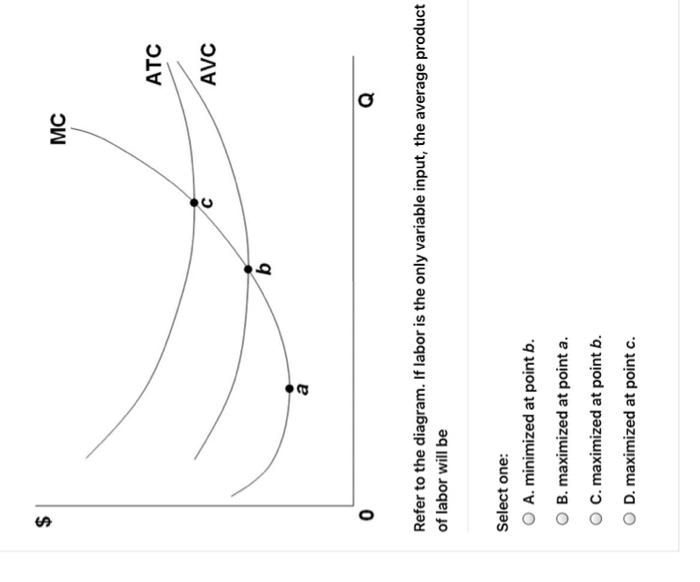 Solved Question 9 $ MC ATC AVC b 0 Q Refer to the diagram. | Chegg.com If labor is the only variable input, the average product of labor is at a maximum at point b. O minimum at point b. maximum at point c. maximum at point a. This problem has been solved! You'll get a detailed solution from a subject matter expert that helps you learn core concepts. See AnswerSee AnswerSee Answerdone loading