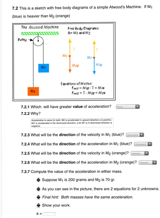 Solved 1. For the Atwood machine apparatus, draw two - Chegg Solved 1. For the Atwood machine apparatus, draw two | Chegg.com Science Physics Physics questions and answers 1. For the Atwood machine apparatus, draw two free-body diagrams which clearly indicate the forces acting on: i. The glider ii. The hanging mass For the following problems, use a glider mass of 0.450 kg. 2.